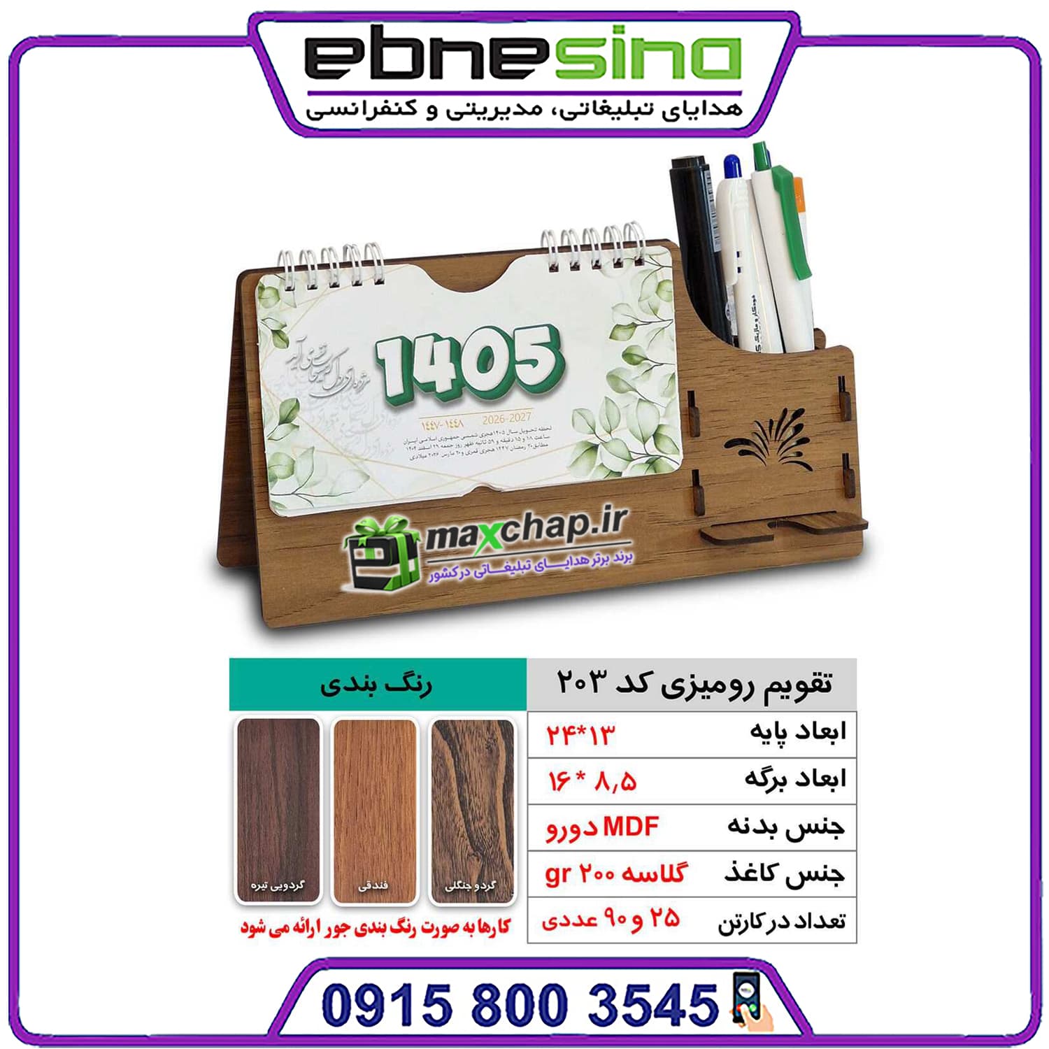 تقویم 1405 با امکان چاپ لوگو و پیام تبلیغاتی، به شما اجازه میدهد برندتان را در طول سال در دید مشتریان نگه دارید. این محصول بهخاطر اندازه مناسب و ظاهر جذاب، روی میز کارمندان یا مدیران جایگاه ویژهای پیدا میکند.