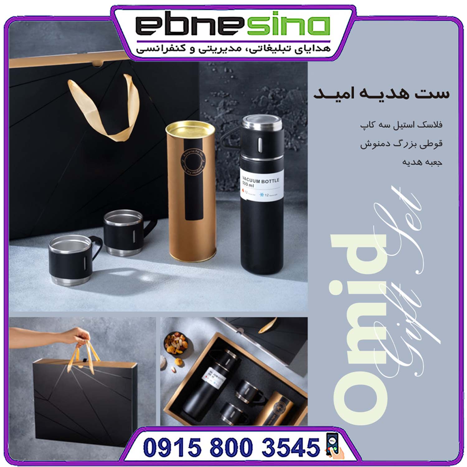 ست مدیریتی امید یکی از گزینههای خاص و پرفروش مجموعه هدایای تبلیغاتی ابنسینا است. ترکیب فلاسک استیل سهکاپ و قوطی بزرگ دمنوش درون جعبه هدیه لوکس، این محصول را به انتخابی ایدهآل برای مدیران، همکاران و مشتریان ارزشمند تبدیل کرده است.