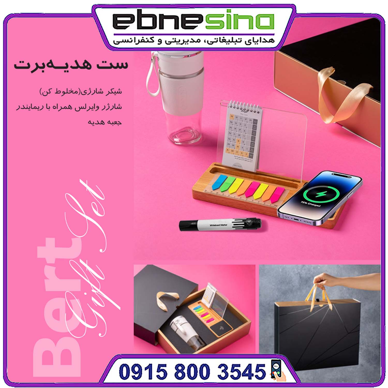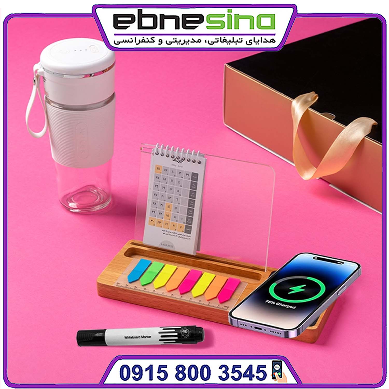 دستگاهی جمع و جور و قابل حمل برای تهیه انواع نوشیدنیهای انرژیزا، اسموتی یا دمنوش در محل کار و سفر. کیفیت بالا و طراحی مدرن آن تجربهای متفاوت از نوشیدن نوشیدنیهای گرم و سرد ارائه میدهد. - تقویم رومیزی همراه با شارژر وایرلس و ریمایندر:
