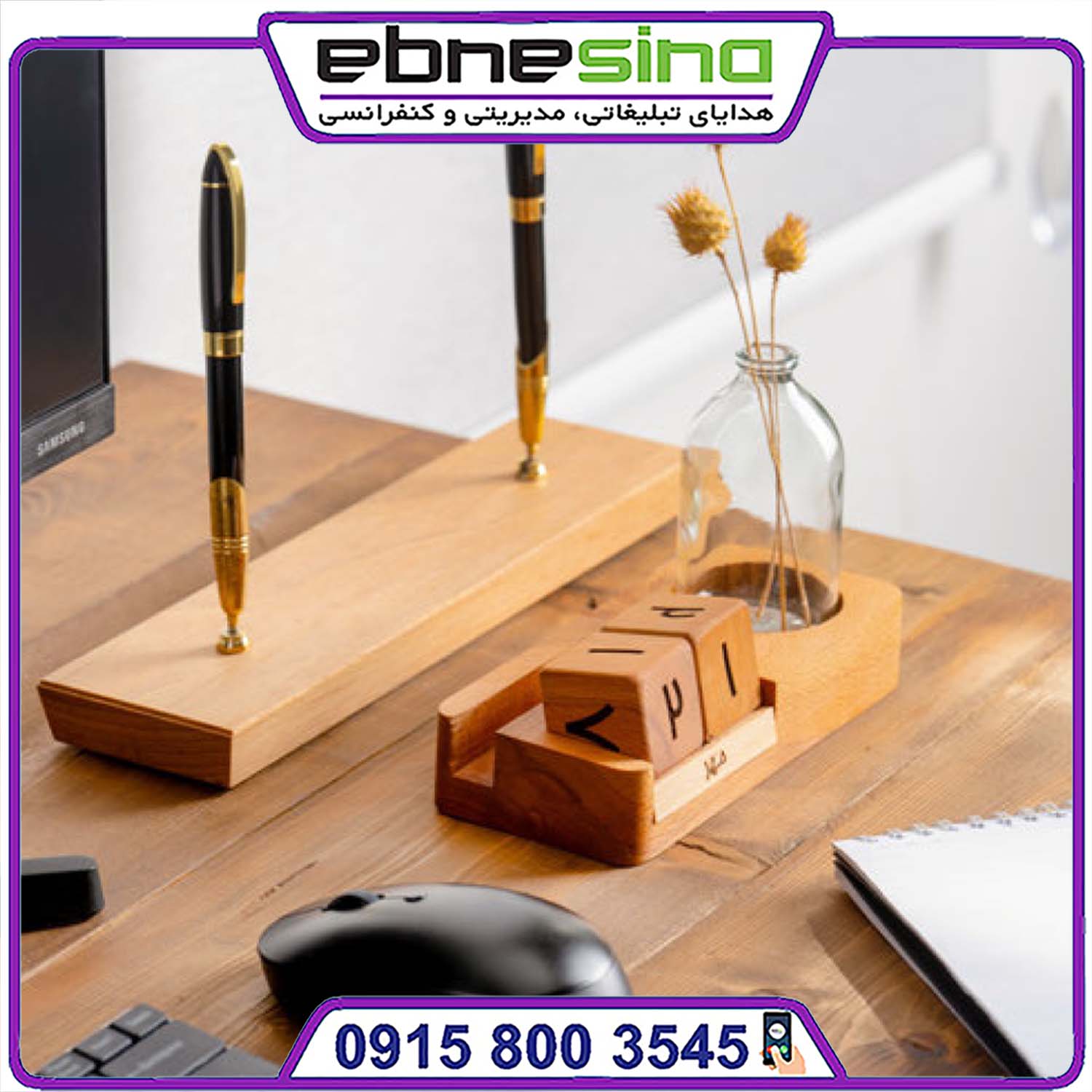 - تقویم رومیزی چوبی به همراه گلدان شیشهای: تقویمی زیبا با پایه چوبی و گلدان شیشهای دکوراتیو که علاوه بر کاربرد تقویم، حس طراوت و لطافت را به میز کار اضافه میکند.