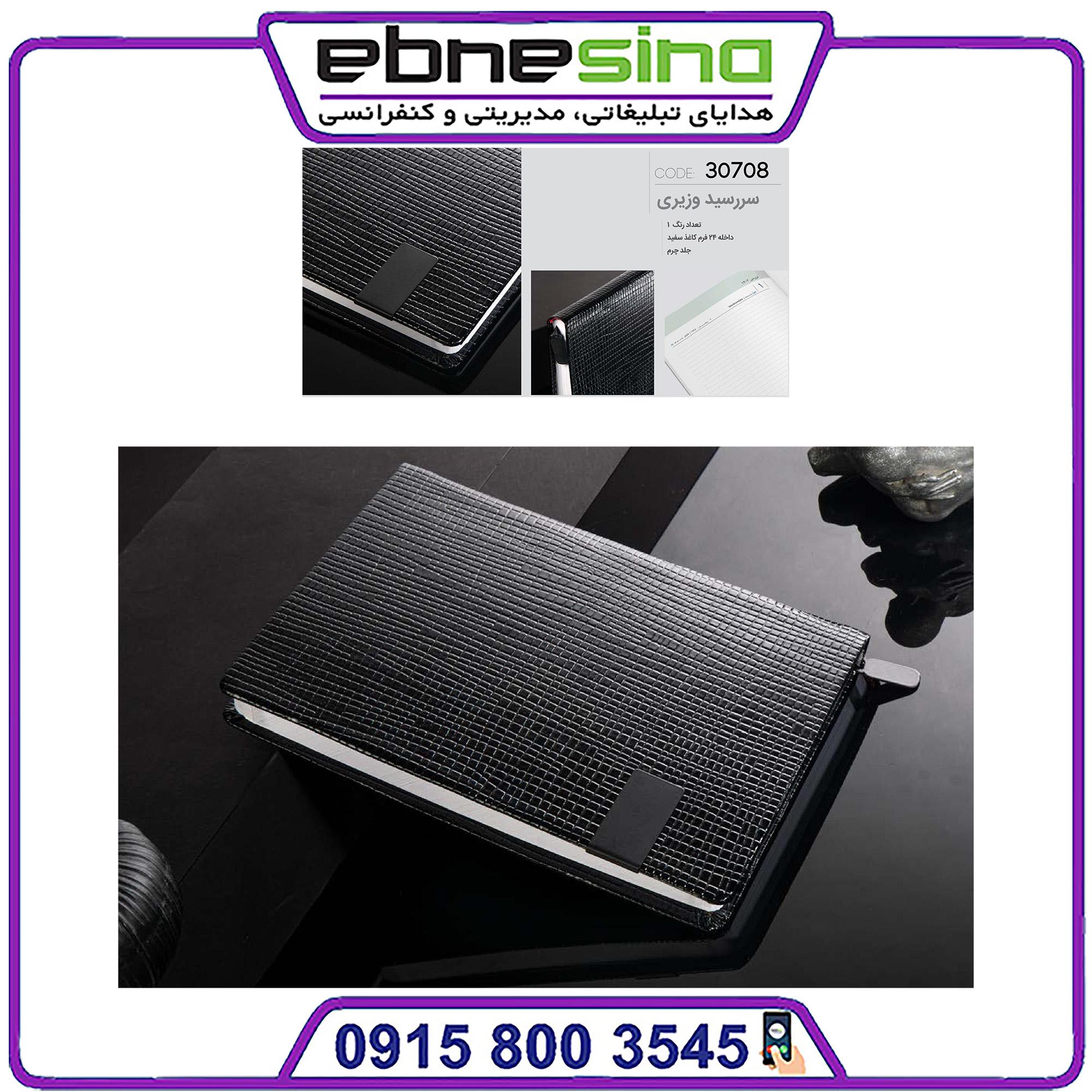 سررسید چرم وزیری مدل 30708 چرمی درجه یک کاغذ داخلی سفید و جمعه جدا دارای پلاک فلزی جهت حک برند و لوگو.