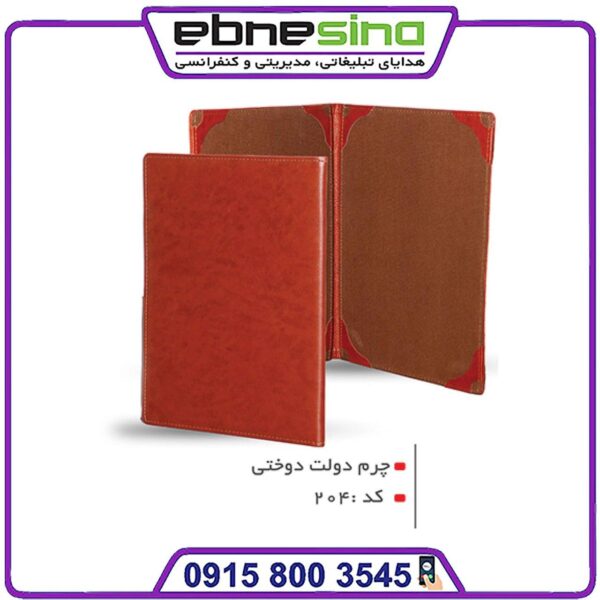 لوح تقدیر چرم دو لت دوختی با طراحی زیبا از جنس چرمی درجه یک تولید شده است.